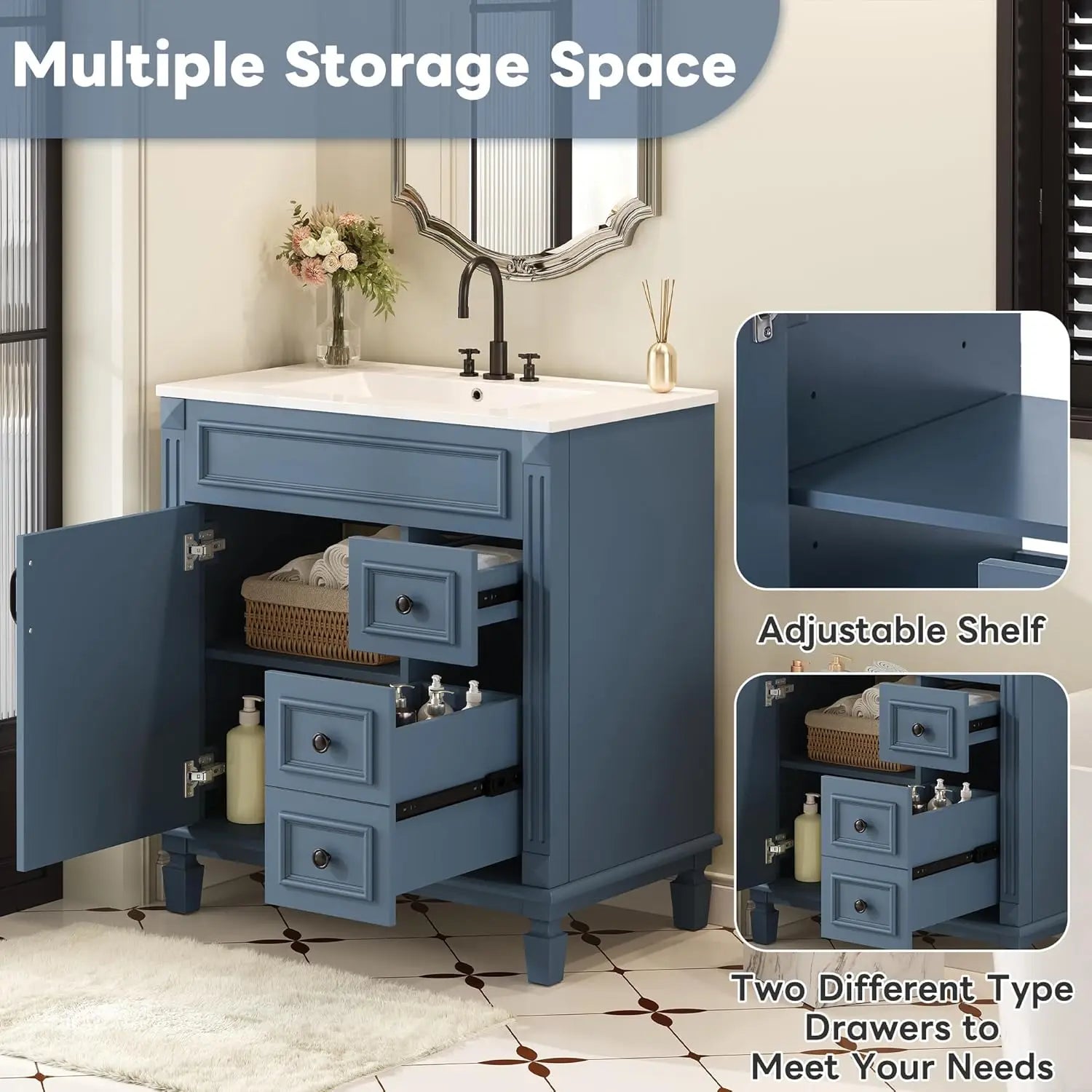 - Maximized storage for you: two drawers—top regular for small items and a deeper bottom drawer—and a spacious cabinet with an adjustable shelf, plus a towel bar for easy access.