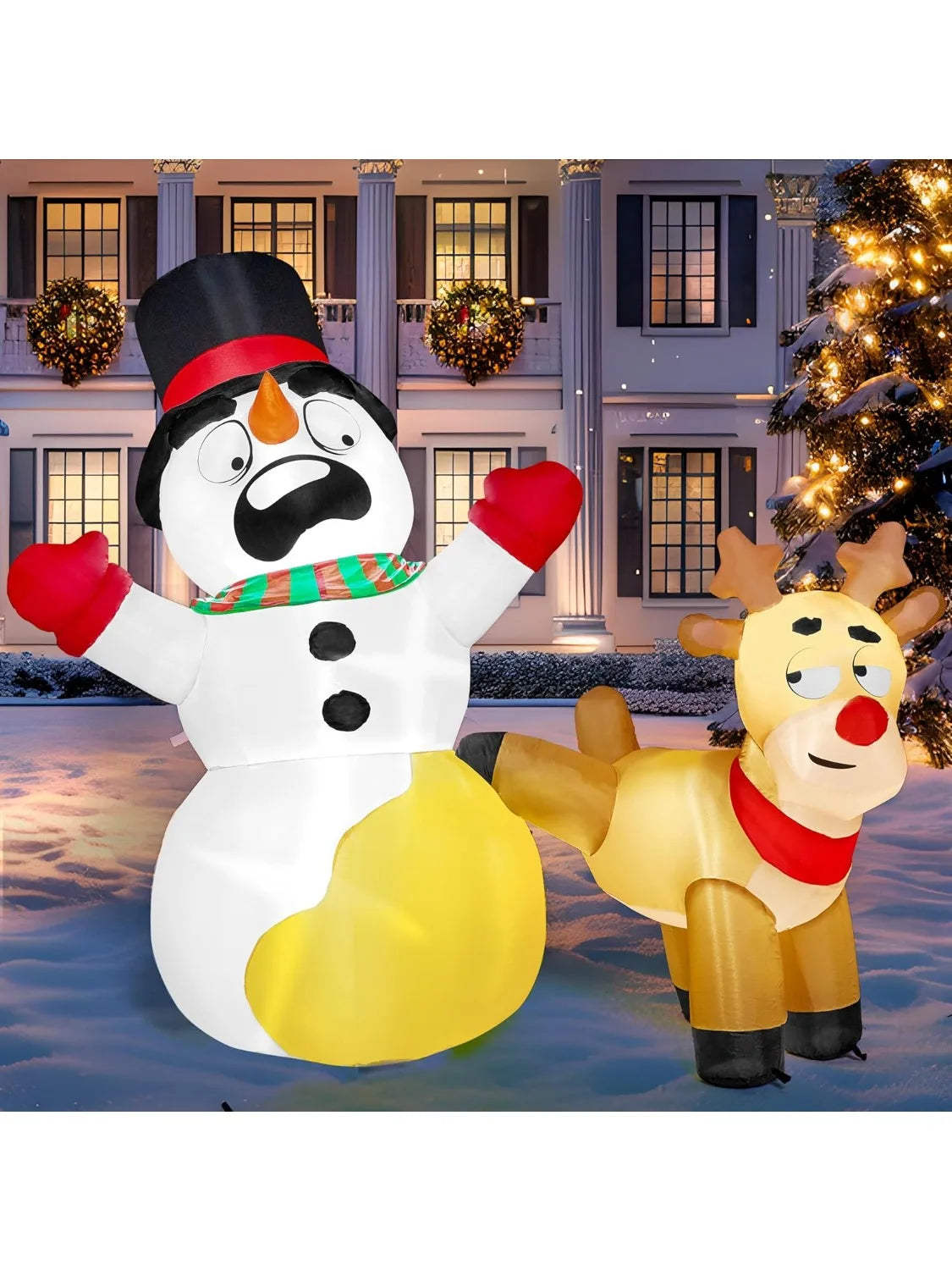 Outstanding Design. This Christmas inflatables decoration features a hilariously cheeky scene of a reindeer peeing on a snowman, who has a comically shocked expression. This playful and unique design is sure to bring laughter and festive fun to your holiday setup. Product size 6.6 x 6 x 3 feet. This inflatable comes with an extended cord, ground stakes, fastened ropes, built-in sandbags, and a plug with UL certification.