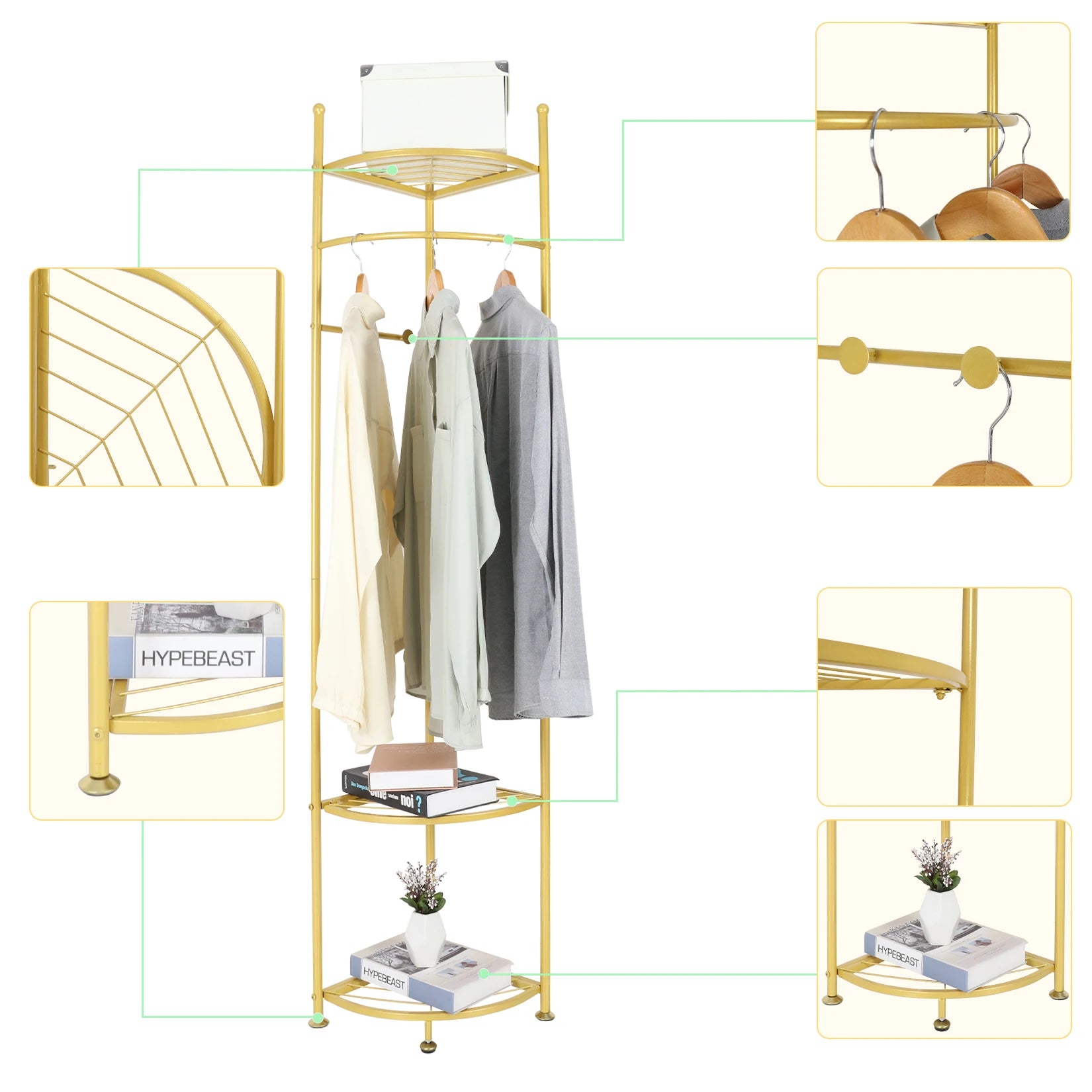 Metal Corner Coat Racks, Gold Clothing Racks Hall Tree, Freestanding Garment Rack with Hooks and Storage Shelf for Hallway