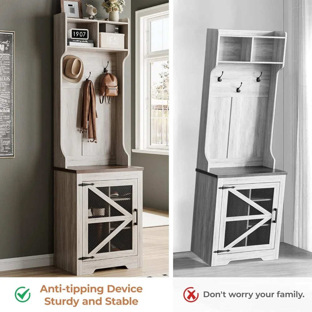 - [3-in-1 Entryway Organizer] This hall tree This hall tree combines the function of coat rack, shoe cabinet and storage shelf. It features 3 hooks, a high bench, a 4-compartment shoe cabinet, and 2 top shelf. A well-chosen hall tree can transform an ordinary entryway into a highly functional and inviting space. Placed at the entryway, these coat hooks ensure that outerwear is stored efficiently, leaving the floor area clutter-free for a clean and organized appearance