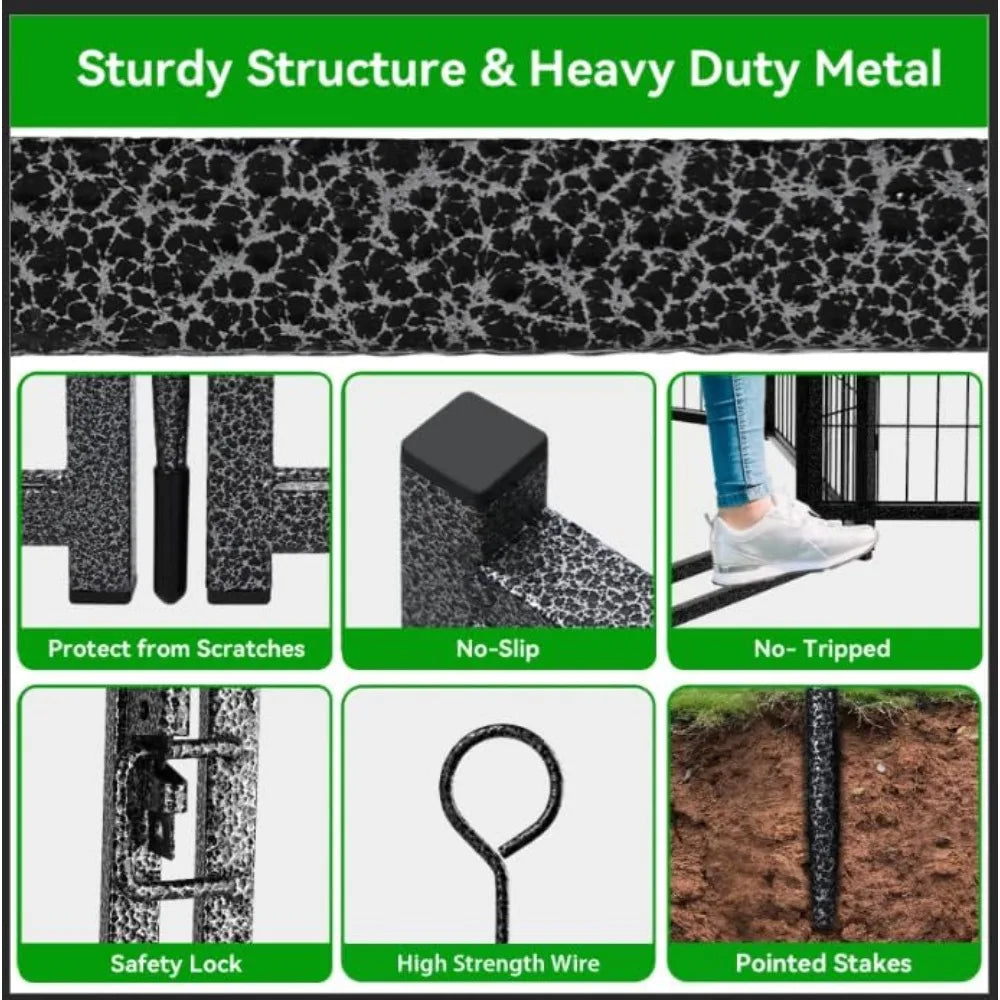 This product is a durable and sturdy dog playpen crafted from heavy-duty metal with anti-corrosion coatings to ensure it withstands outdoor conditions and resists rust. It's designed to keep your pets safe and secure, providing them with a space to play and exercise. The playpen is expandable, allowing you to adjust the size by combining individual panels to create a larger area as needed. Setting up and dismantling the playpen is a breeze, thanks to the separate poles that connect the panels, and it can be configured in various shapes to fit your space. The foldable design makes it portable and easy to store, making it ideal for travel, camping, or simply moving around your yard. The playpen comes with sturdy ground stakes for added stability, ensuring that it remains firmly in place even with active pets. Suitable for dogs of all sizes, as well as other pets like rabbits, ducks, and turtles, this playpen offers a safe and versatile enclosure for your furry friends.