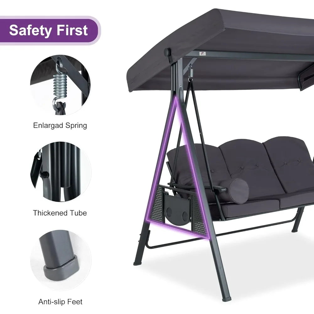 Outdoor Patio Porch Swing with Stand, 3-seat Swing Chair with Adjustable Tilt Canopy All-Weather Steel Frame for Backyard Front